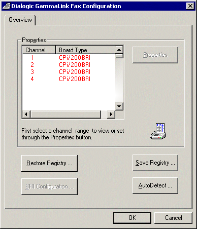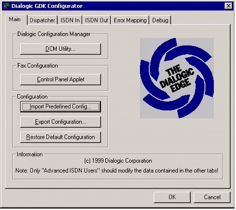 Select the .prf that matches the BRI line you have connected to the new ISDN BRI board in the FaxPress Premier (for example, gdk_bri_euro_CPI400BRIPCI.prf), then click Open. The Dialogic GDK Configurator Window reappears. |