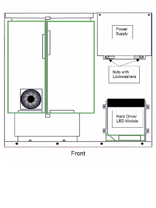 Replace the 2 rear panel screws that hold the bottom portion of the power supply to the rear panel of the FaxPress Premier, and then replace the 2 nuts with lock washers that hold the power supply to the base of the chassis. |