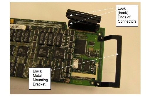 Make sure you install the ribbon bus cable with the lock (hook) ends of the connectors toward the BACK PANEL of the FaxPress Premier chassis, as shown below. This orientation will mean that the hooks are on the ends of the connectors that are AWAY from the Black Metal Mounting bracket, as shown. To add 2 upgrade boards, connect the ribbon bus cable to both of the new boards. |
