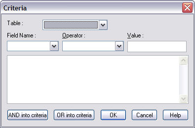 You can define a filter on the database by clicking on the Build Criteria button. The Criteria dialog box will be displayed. |
