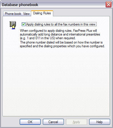 To apply the dialing rules that have been defined in Server Properties for every fax number in this view, click the box. See Dialing Properties. |