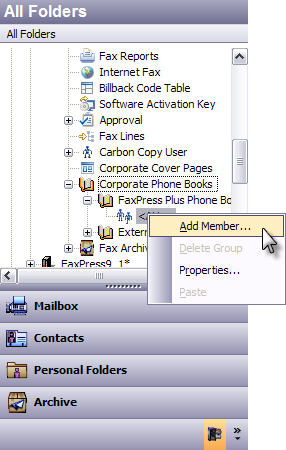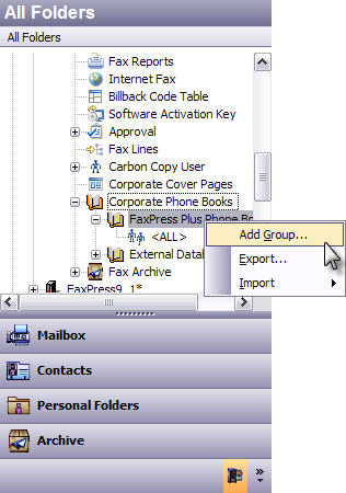 Expand the Corporate Phone Books. Right-click on FaxPress Phone Books. Select Add Group. |