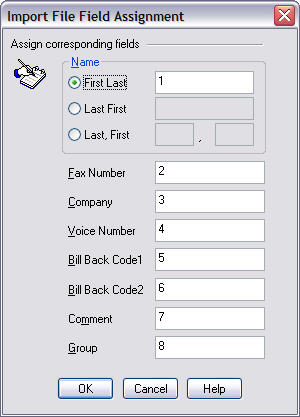 The default values in this dialog box are 1 through 7 respectively. Re-sequence the fields to correspond to your custom file. If you do not have one of the default fields in your custom file, leave the field blank. In the figure above, the custom file does not have fields for Voice number, Comment or Group.