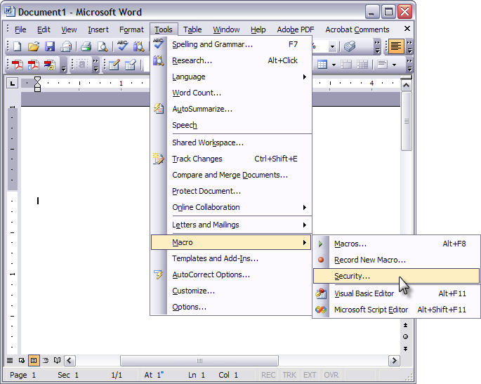 Before installing, make sure your Microsoft Security settings are set to Medium or Low, rather than High, by opening a Word document and going to Tools>Macro>Security.