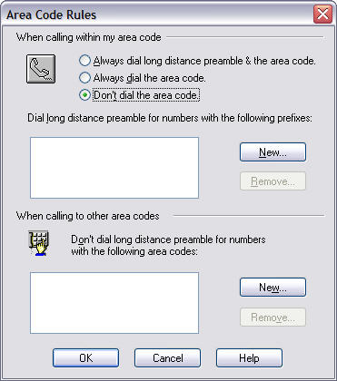 Likewise, when making long distance phone calls, you may not need to use area codes and long distance preambles for certain area codes. To specify the areas codes that do not require the addition of area code numbers, click New in the When calling to other area codes area.